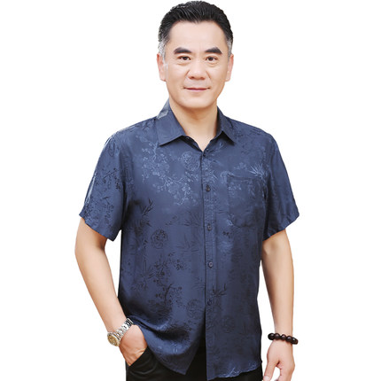 爸爸夏装衣服真丝衬衫男士短袖桑蚕丝中老年大码老人衬衣丝绸男装